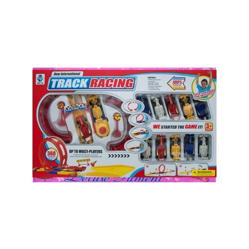 Get ready to race to the finish line with this 20-piece Deluxe Track Racing Set. Kids will love the exciting racing possibilities it provides. Cars are powerfully launched with a button onto the race tracks that can be set up with a full loop or as a straight track. Set includes twelve mini racing cars, one launcher, two straight tracks, two annular tracks, one annular track base, one finishing track and one accessories set. Package measures approximately 22" x 13" x 2". Comes packaged in a window box.
