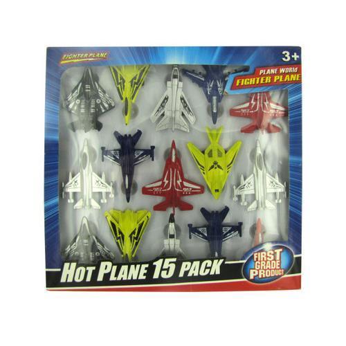 Case of: 18Colors: black, green, blue, red, silverMaterials: metal, plasticKids' imaginations will soar with this colorful and realistic 15-piece Fighter Plane Set featuring movable wheels and detailed paint. Each plane...