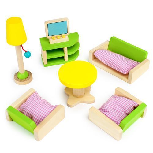 From the elegant floor lamp and flat screen TV to the oversized, cushy recliners and couch, this is one luxurious living room set that's sure to add tons of comfort to your dollhouse! Cut from natural wood and finished with safe, water-based paint. Includes 10 pieces in all, perfect for ages 4 and up.