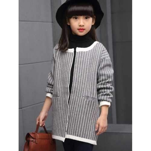 Girl's Long Sleeve Vertical Stripe Loose Fitting Coat - Gray 130
